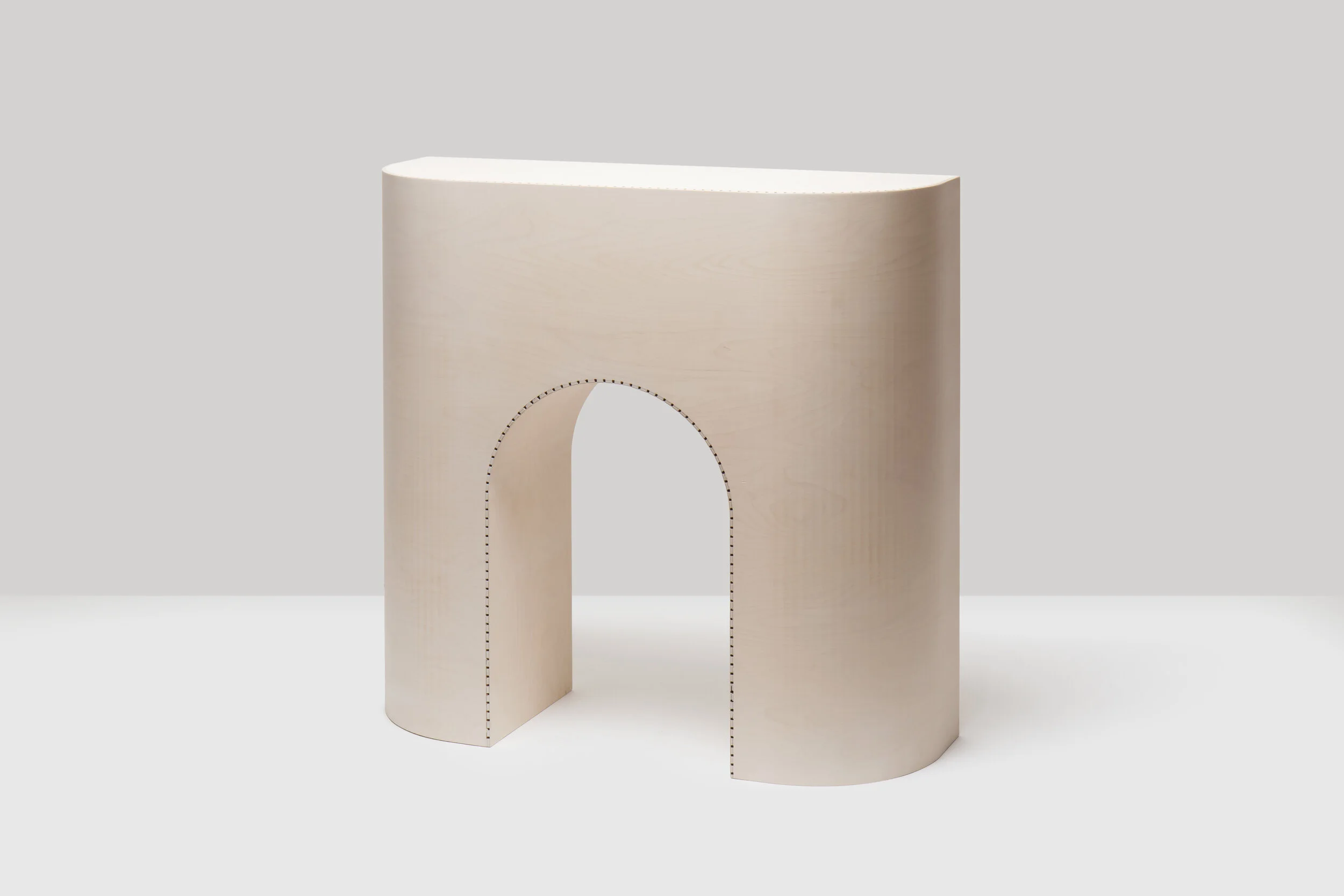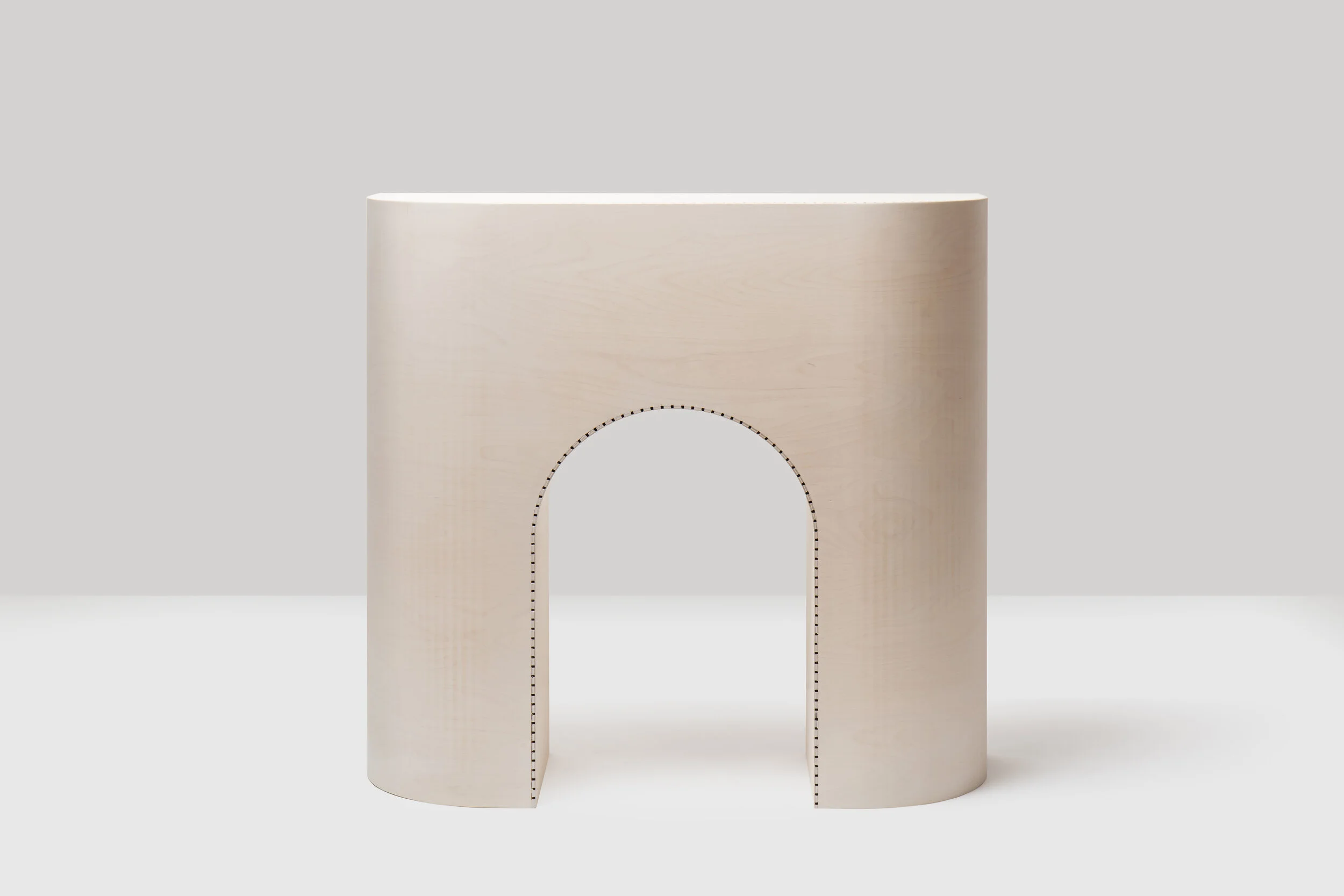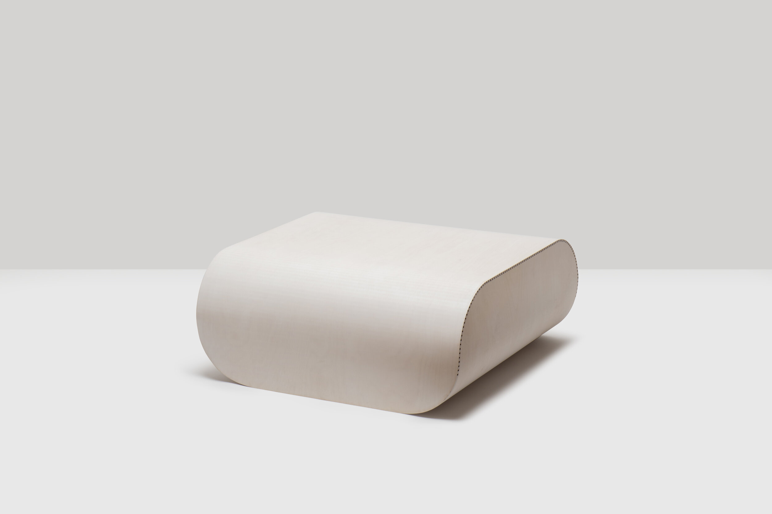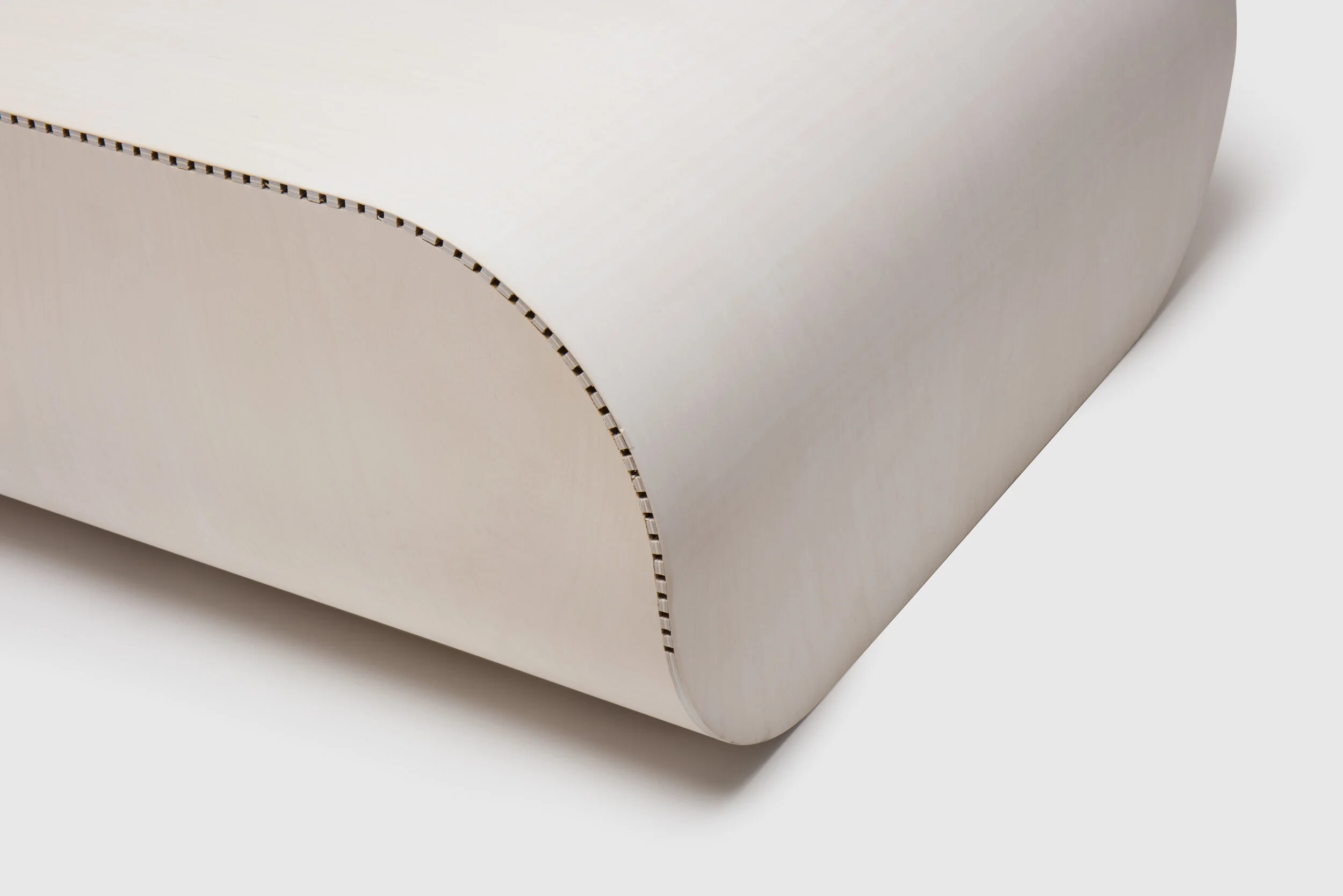 When making a curve for a Layered series product, I make a cut on only one side of a PP board and bend it along the cut line. I thought it might be possible to apply the same technique to wood, so I started experimenting with what resulted in the Kerf series. A specific technique called ‘Kerf bending’, which makes gaps with a certain depth at regular intervals to create a curve, is applied during the stool making process. You can see the stitch-like pattern lining the edge of structural members, it is cut marks produced by a Computerized Numerical Control (CNC) machine.